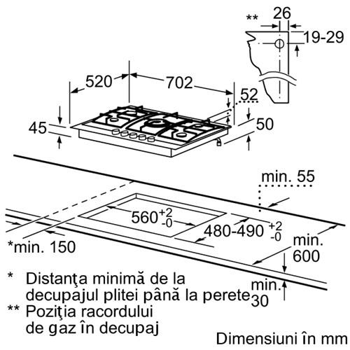 Dimensiunile plitei incorporabile Bosch PCR715M90E sunt de 5,2X70,2X52, dimensiunea nisei reprezinta 45X56X48-49, iar grosimea minima a blatului este de aproximativ 30 milimetri.